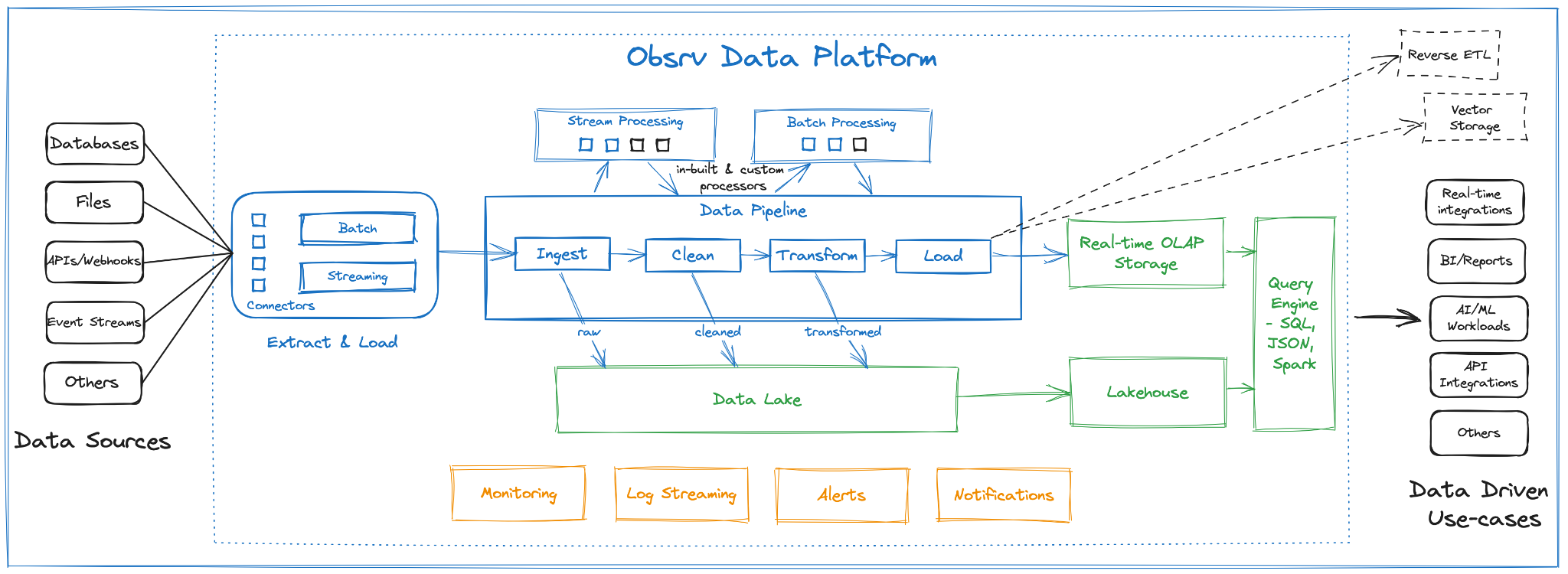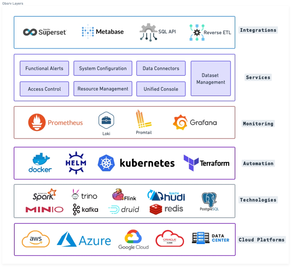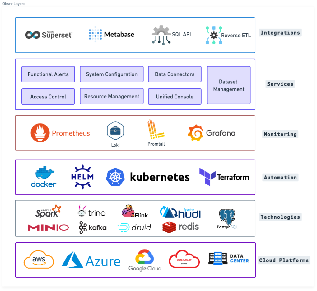 Obsrv fuses multiple technologies together with extreme automation and detailed monitoring coupled with intelligent services to work on any cloud to enable multiple data use-cases via decoupled integrations. The chaining together of these layers give Obsrv its scalability, reliability and efficiency.