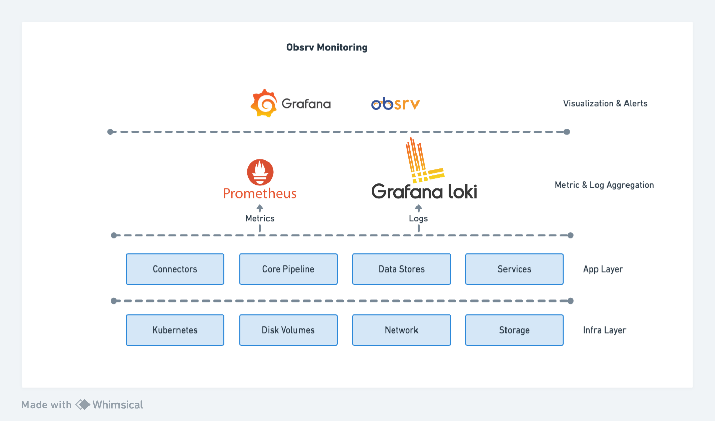 Obsrv offers a robust monitoring system to monitor the performance and health of the entire system. The infrastructure, application and service components are all configured to emit metrics and logs. Obsrv uses Prometheus as the default metric aggregation system and Grafana Loki as the default log aggregation system from various components.