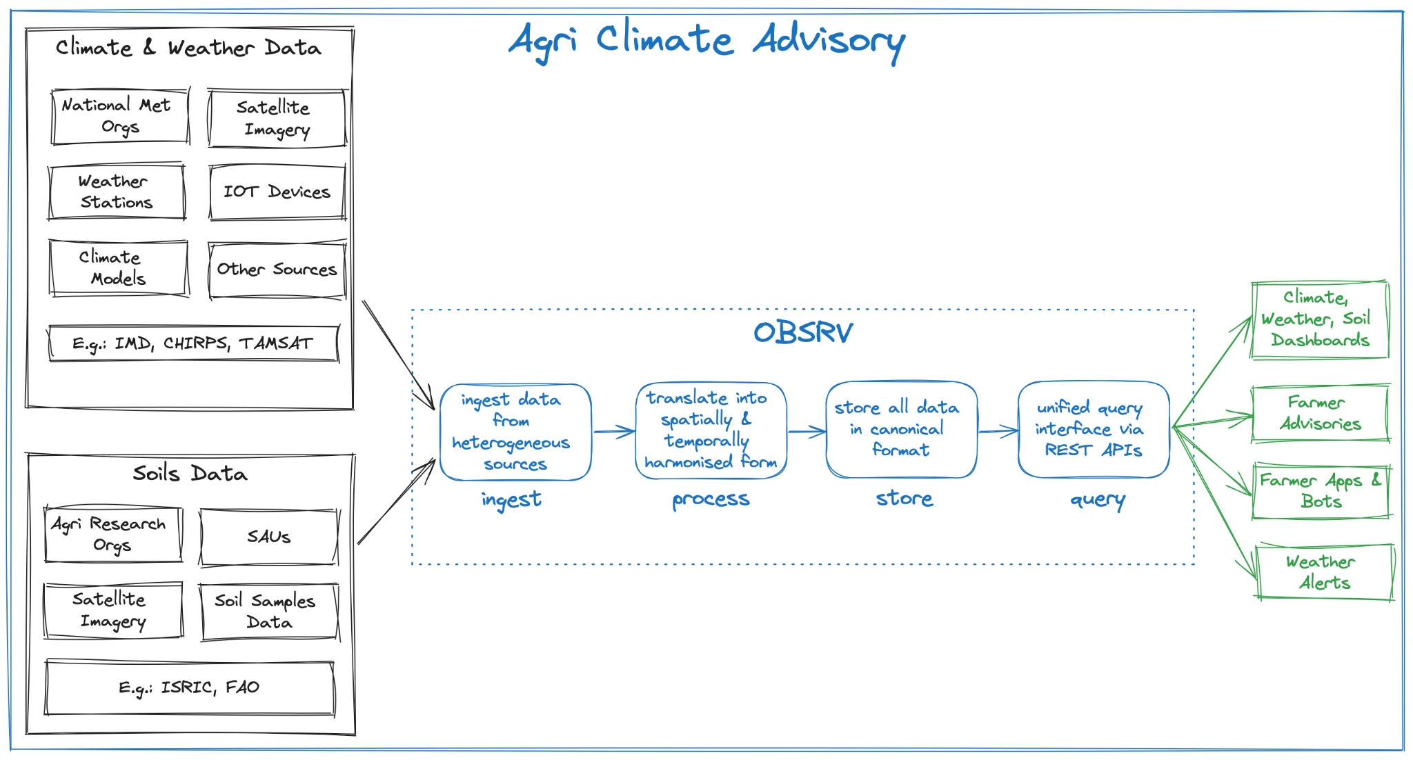 OBSRV is a transformative solution for climate-based agriculture advisory, empowering agri-meteorologists to harness the power of data for informed decision-making. By facilitating the ingestion, harmonization, and accessibility of diverse climate and soil data, OBSRV enables agri-meteorologists to provide context-rich advisories that enhance agricultural resilience, productivity, and sustainability.